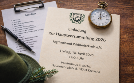 Liebe Mitglieder, im Frühjahr steht ein wichtiger Termin im Verbandsjahr an: die Hauptversammlung des Jagdverbandes Weißeritzkreis e.V. Hiermit laden wir Sie herzlich zur Teilnahme ein. 📅 Termin der Versammlung: Freitag, 10. April 2026 🕖 Beginn: 19:00 Uhr 📍 Veranstaltungsort Vereinshaus KreischaHaußmannplatz 801731 Kreischa Tagesordnung Die […]